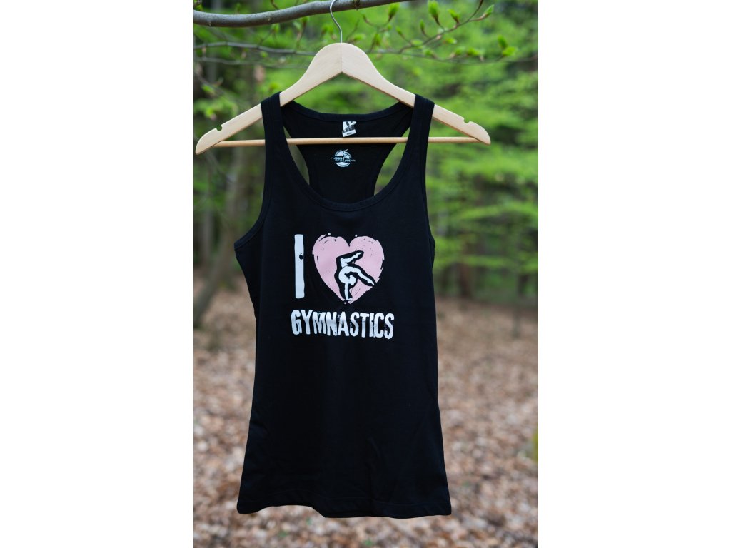 Přiléhavé sportovní tílko s vykrojením na zádech a potiskem I LOVE GYMNASTIC